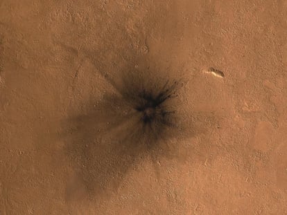 A spacecraft reveals new crater measuring about 492 feet in diameter. At the edges of the hole, the white glow of at least a ton of ice can be clearly seen