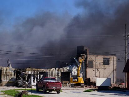 Multiple fires continued burning Wednesday within about 14 acres of various types of plastics stored both inside and outside buildings at a former factory site in Richmond, 70 miles east of Indianapolis