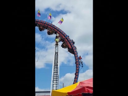 The roller coaster’s cars got stuck near the top of a loop around 1:30 p.m. Sunday at the Crandon International Offroad Raceway