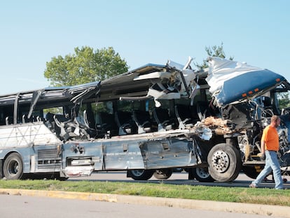 State police say the bus was traveling westbound along Interstate 70 in Madison County when it crashed into the semis just before 2 a.m.