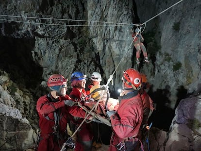 He emerged from the cave early Tuesday strapped to a stretcher and was whisked to a hospital by helicopter