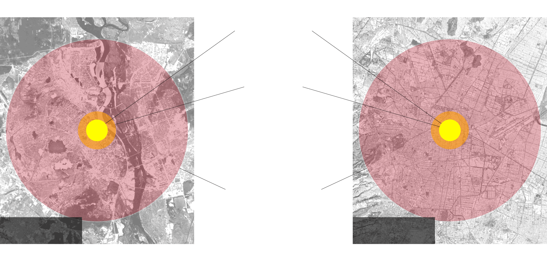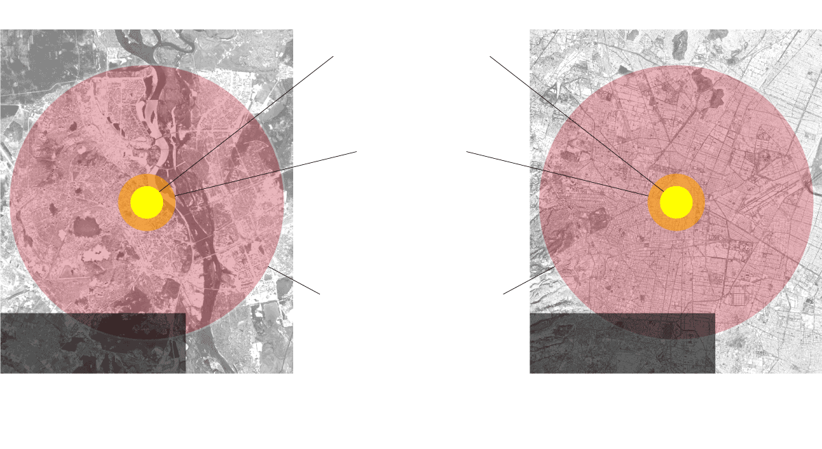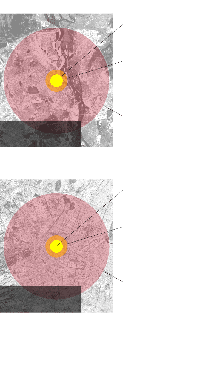 Estimation for the first 24 hours after the launch of the bomb based on nukemap simulator (nuclearsecrecy.com).