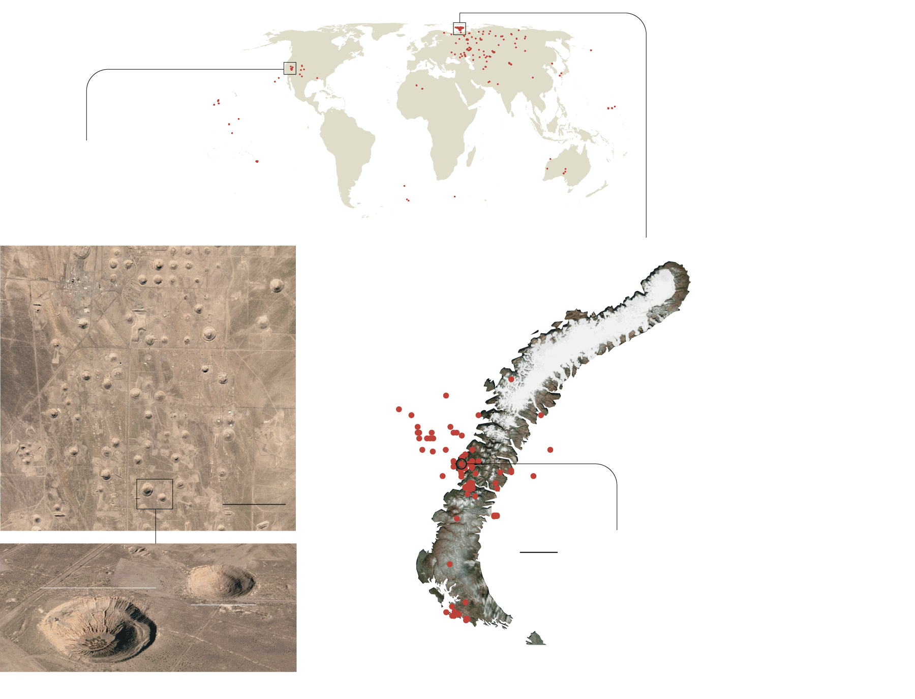 Test site of the biggest nuclear explosion in history: the Tsar bomb. It was detonated with a nuclear warhead of 58 megatons, the equivalent of 58,000 tons of TNT.