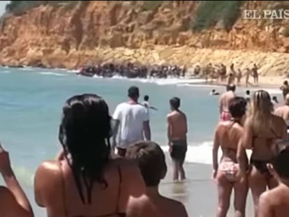 Beachgoers looked on in astonishment as dozens of people jumped out of the small vessel and ran towards the cliffs
