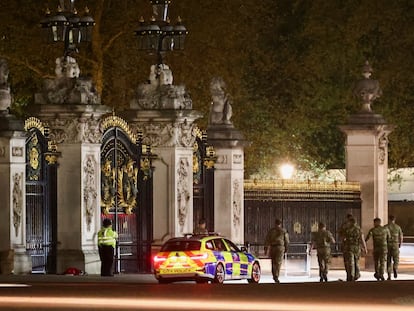 The Metropolitan Police force said officers arrested the man after he approached the palace gates and threw items suspected to be shotgun cartridges onto the grounds